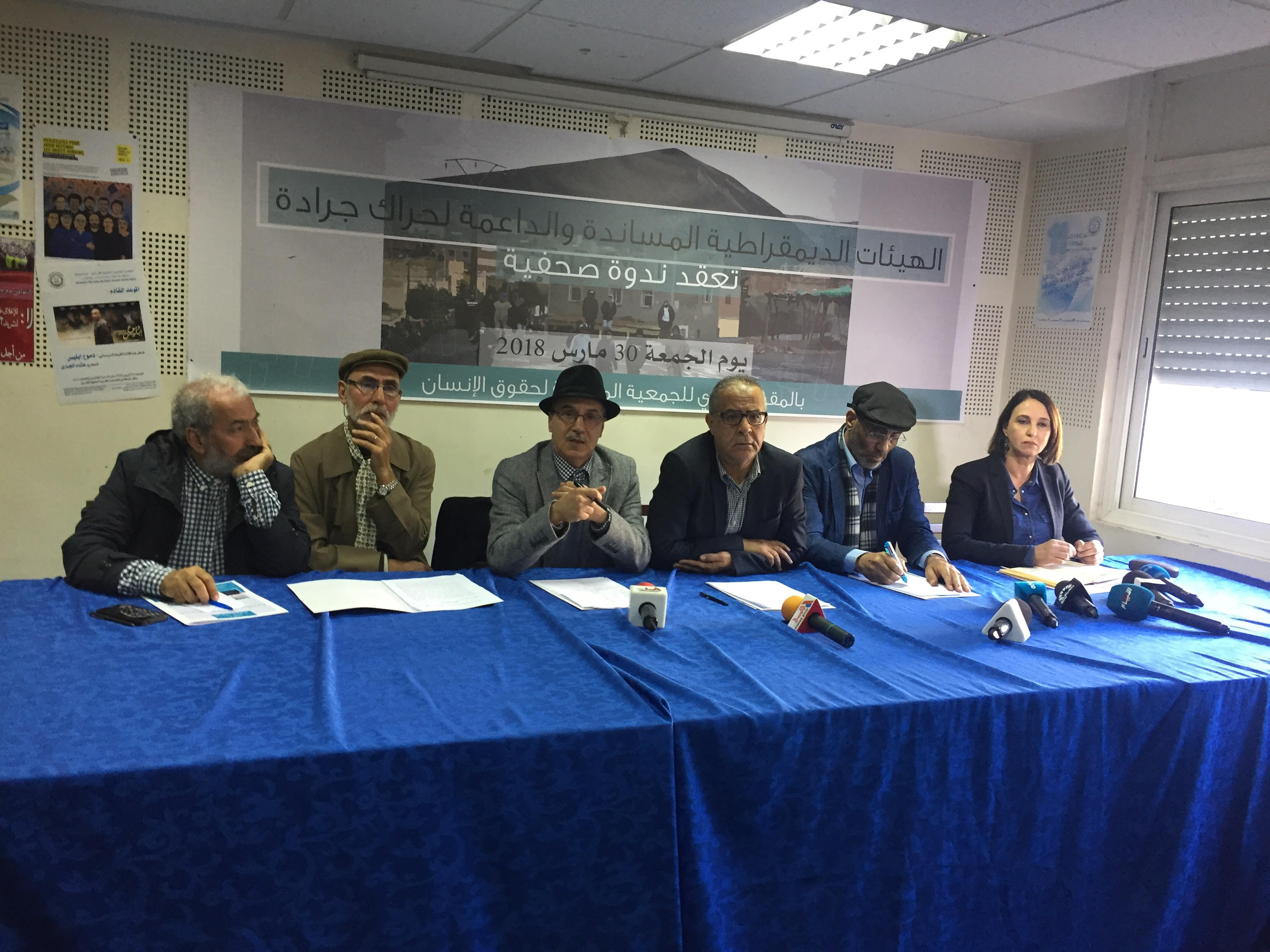 الهيئات الديمقراطية المساندة والداعمة لحراك جرادة تصريح صحفي الرباط في 30 مارس 2018 السيدات و السادة ممثلي وسائل الإعلام. نحييكم تحية تقدير واحترام، ونشكركم على تلبية الدعوة لهذا اللقاء الصحفي الذي تعقده هذه المبادرة المشكلة من عدد من الهيئات الديمقراطية المساندة والداعمة لحراك جرادة، والذي نهدف من خلاله توضيح موقفنا للرأي العام من تطورات الوضع ببلادنا في كل أبعاده، خاصة الاقتصادية والاجتماعية والحقوقية. فالمغرب يعيش على وقع حالة احتقان اجتماعي حاد وغير مسبوق، ينذر بالانفجار في أي لحظة، نتيجة سياسات اقتصادية تفقيرية، لا اجتماعية وتبعية خاضعة لقوى الرأسمال ومؤسساته المالية؛ وهي ذات السياسات التي ظهرت انعكاساتها على مختلف مناحي الحياة، حيث اتسعت دائرة الفقر وزادت هوة الفوارق الطبقية والمجالية. ومع أن كل المؤشرات الموضوعية الصادرة عن مؤسسات وطنية وأجنبية ذات مصداقية، تؤكد أن السياسات العمومية المتبعة منذ سنوات، لا يمكن أن تؤدي إلا إلى مزيد من التفقير والهشاشة الاقتصادية والاجتماعية، رغم ذلك فإن الدولة مصرة على نهجها النيوليبرالي المتوحش والتغييب الممنهج لدورها الاجتماعي في تقديم الخدمات العمومية. وها هي تتجه اليوم لتصفية ما تبقى من صندوق المقاصة بعد تحرير أسعار المحروقات وتحرير سعر صرف الدرهم وضرب مكتسبات الشغيلة في مجال التقاعد، والاجهاز على التعليم العمومي ومجانيته وتسليع الخدمات العمومية، وصولا إلى ضرب الوظيفة العمومية ومأسسة الهشاشة في علاقات الشغل وفرض المزيد من المرونة، مستغلة حالة البطالة التي تصل نسبتها لأكثر من 16 في المائة في المجال الحضري وحوالي 30 في المائة في أوساط الشباب. إن الوضع الوطني في كل أبعاده السياسية والاقتصادية والاجتماعية يعرف حالة من الانحباس الشامل، وهو ما يفسر تعدد وتواتر الحركات الاحتجاجية التي تشهدها مجموعة من مناطق المغرب العميق، بدءًا من الحراك الشعبي بالحسيمة، وما خلفه من انتهاكات لحقوق الإنسان بفعل اعتماد مقاربة أمنية قمعية، رافقها الاستعمال المفرط للقوة، وممارسة التعذيب والمس بالحق في الحياة والسلامة الجسدية، كما أسفرت عن جملة من الاعتقالات والمحاكمات التي مازالت مستمرة إلى حدود اللحظة. أيتها السيدات أيها السادة؛ نعيش اليوم ،على وقع نفس المقاربة في مدن ودواوير أخرى، كان آخرها ما شهدته مدينة جرادة، التي خرجت ساكنتها في حركة احتجاجية سلمية تعبر بشكل حضاري عن مطالب اقتصادية واجتماعية عادلة ومشروعة، لكن جواب الدولة وحكومتها، كان للأسف أمنيا وقمعيا، بعد بلاغ وزارة الداخلية التهديدي والمستفز، الذي يضرب ركنا أساسيا من أركان ممارسة الحريات العامة، ألا وهو الحق في التظاهر السلمي. إن ما وقع في جرادة، يوم 14 مارس 2018، ويقع في غيرها من المناطق التي تعرف حراكا اجتماعيا شعبيا، يبين بالملموس أن الوضع الاجتماعي يتجه نحو مزيد من الاحتقان وأن الدولة عاجزة عن تقديم أجوبة على مطالب المواطنات والمواطنين، ولا تملك إلا الجواب الأمني القمعي. فاعتقال أكثر من 500 ناشط، واستمرار المحاكمات والمتابعات والأحكام القاسية، ومحاصرة الأنشطة ومنعها، ورفض تسليم وصولات الإيداع للتنظيمات وغيرها من مظاهر الاستبداد والسلطوية، يوضح بأننا نعيش اليوم عودة لممارسات مغرب سنوات الرصاص، وأن بلادنا تشهد ردة حقوقية خطيرة ووضعا اجتماعيا صعبا في ظل اعتراف رسمي بفشل النموذج التنموي، لكن مع الإصرار على المضي قدما في الاختيارات الاقتصادية اللاديمقراطية واللاشعبية، تنفيذا لإملاءات المؤسسات المالية الدولية وخدمة لمصالح لوبيات الريع و الفساد. في حين ان المدخل الأساسي لتجاوز الاحتقان العام، لن يتأتى إلا بتحقيق جدلية الديمقراطية الشاملة و المقرونة بتنمية عادلة، تمكن أوسع شرائح الشعب المغربي من سلطة قرارها وكرامة عيشها وحقها في التوزيع العادل للثروة إن التنظيمات الحاضرة اليوم، وبعد وقوفها على الوضع الوطني المأزوم في بعده الاجتماعي على الخصوص، 