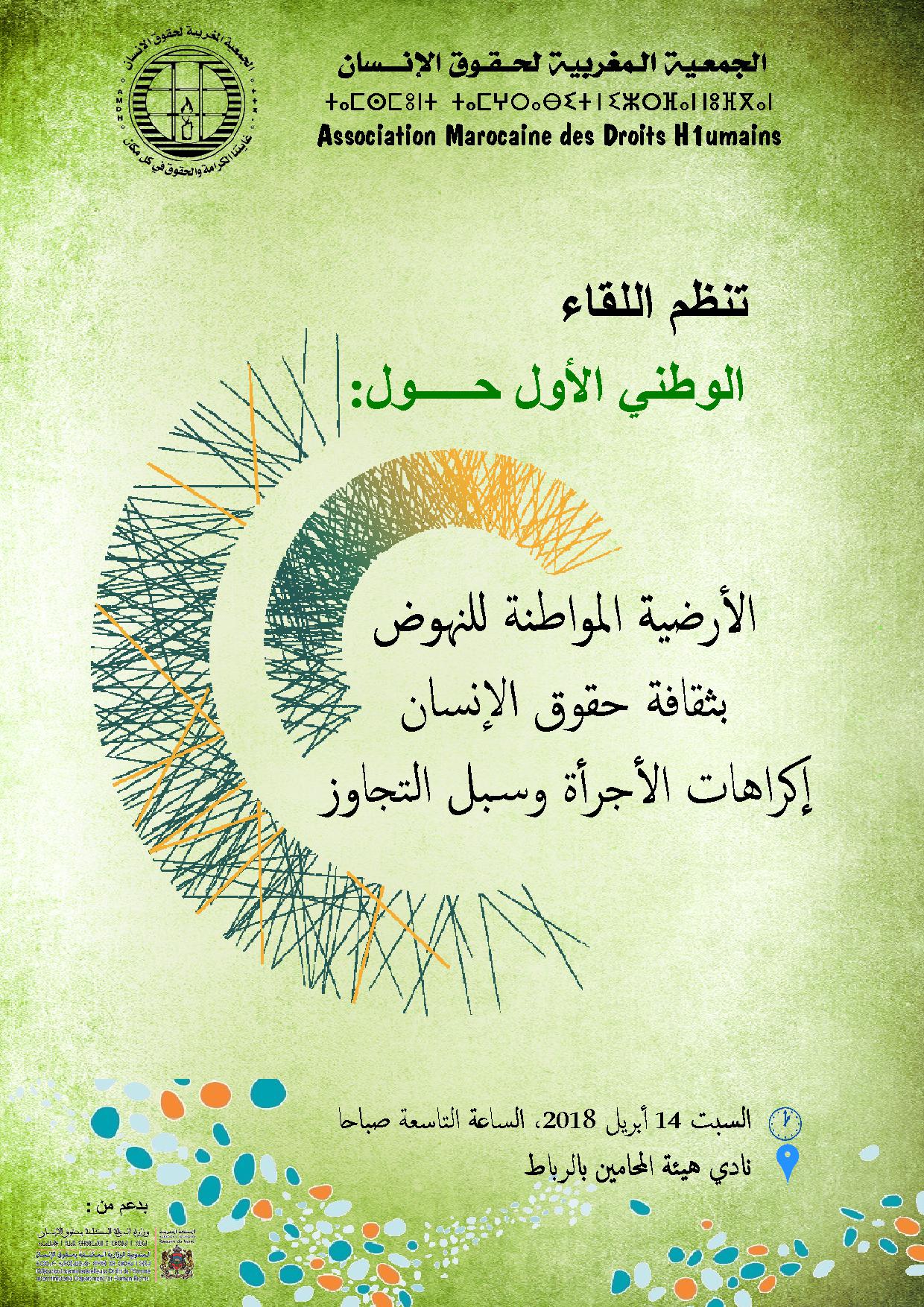 بلاغ إخباري بانعقاد لقاء وطني حول "الأرضية المواطنة للنهوض بثقافة حقوق الإنسان؛ إكراهات الأجرأة وسبل التجاوز" السبت14 أبريل 2018 نادي هيئة المحامين بالرباط في إطار "مشروع مواطنة"، الذي يجري انجازه بشراكة بين الجمعية المغربية لحقوق الإنسان ووزارة الدولة المكلفة بحقوق الإنسان، تنظم الجمعية لقاء وطنيا مع مختلف الفاعلين المعنيين بالأرضية المواطنة للنهوض بثقافة حقوق الإنسان، حول موضوع " الأرضية المواطنة للنهوض بثقافة حقوق الإنسان إكراهات الأجرأة وسبل التجاوز "، وذلك يوم السبت 14 أبريل 2018، بنادي هيئة المحامين بالرباط. ويندرج هذا اللقاء فى سياق تفعيل أهداف الجمعية فى مجال النهوض بقيم وثقافة حقوق الإنسان، وارتكازا على المرجعية الحقوقية الكونية ومع معايير الأمم المتحدة في هذا المجال، وخاصة "إعلان الأمم المتحدة للتثقيف والتدريب في ميدان حقوق الإنسان"، الذي أكد على الأهمية الأساسية لإعمال كافة حقوق الإنسان، وتعزيز التسامح وعدم التمييز والمساواة والكرامة كغايات كبرى، والإسهام في منع انتهاكات وتجاوزات حقوق الإنسان ومناهضة القوالب النمطية. وسيعرف هذا اللقاء، علاوة على كلمتي الجمعية المغربية لحقوق الإنسان ووزارة الدولة المكلفة بحقوق الإنسان، مداخلات لفاعلين واكادميين حول المحاور التالية: • السياقات والمضامين والغايات الكبرى والمبادئ المرجعية المؤسسة للأرضية المواطنة. • دور المنظومة التربوية في النهوض بثقافة حقوق الإنسان • المجلس الوطني لحقوق الإنسان؛ "الحصيلة والمنجز من الأرضية في مجال التربية والتكوين والتحسيس. • الاكراهات السياسية والمؤسساتية التي حالت دون تفعيل الأرضية. المكتب المركزي الرباط في، 05 أبريل 2018