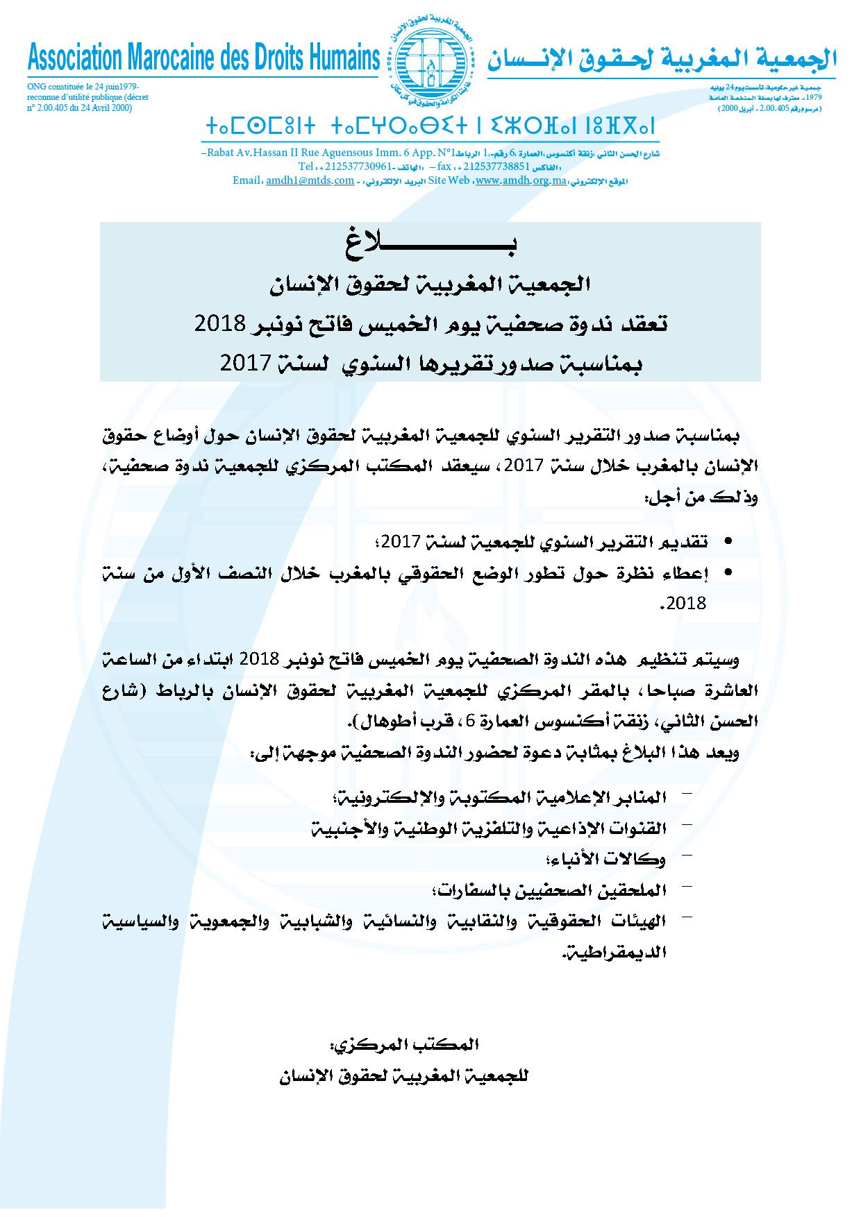 بــــــــــــــــــلاغ الجمعية المغربية لحقوق الإنسان تعقد ندوة صحفية يوم الخميس فاتح نونبر 2018 بمناسبة صدور تقريرها السنوي لسنة 2017 بمناسبة صدور التقرير السنوي للجمعية المغربية لحقوق الإنسان حول أوضاع حقوق الإنسان بالمغرب خلال سنة 2017، سيعقد المكتب المركزي للجمعية ندوة صحفية، وذلك من أجل: • تقديم التقرير السنوي للجمعية لسنة 2017؛ • إعطاء نظرة حول تطور الوضع الحقوقي بالمغرب خلال النصف الأول من سنة 2018. وسيتم تنظيم هذه الندوة الصحفية يوم الخميس فاتح نونبر 2018 ابتداء من الساعة العاشرة صباحا، بالمقر المركزي للجمعية المغربية لحقوق الإنسان بالرباط (شارع الحسن الثاني، زنقة أكنسوس العمارة 6، قرب أطوهال). ويعد هذا البلاغ بمثابة دعوة لحضور الندوة الصحفية موجهة إلى: المنابر الإعلامية المكتوبة والإلكترونية؛ القنوات الإذاعية والتلفزية الوطنية والأجنبية وكالات الأنباء؛ الملحقين الصحفيين بالسفارات؛ الهيئات الحقوقية والنقابية والنسائية والشبابية والجمعوية والسياسية الديمقراطية. المكتب المركزي: للجمعية المغربية لحقوق الإنسان