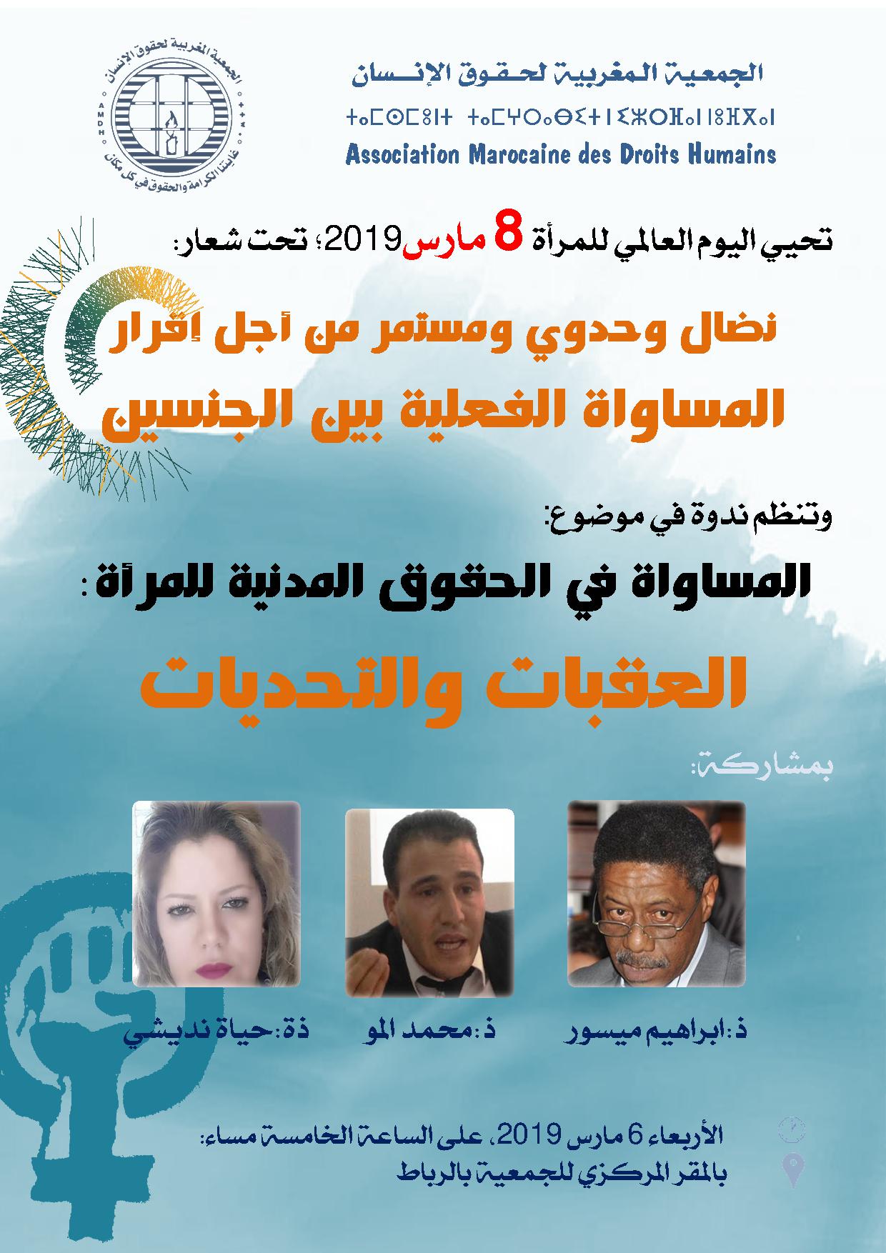 وكمساهمة في تسليط المزيد من الضوء على ما تعانيه النساء من حيف يمس حقوقهن المدنية، تنظم الجمعية المغربية لحقوق الإنسان،ندوة في موضوع:
