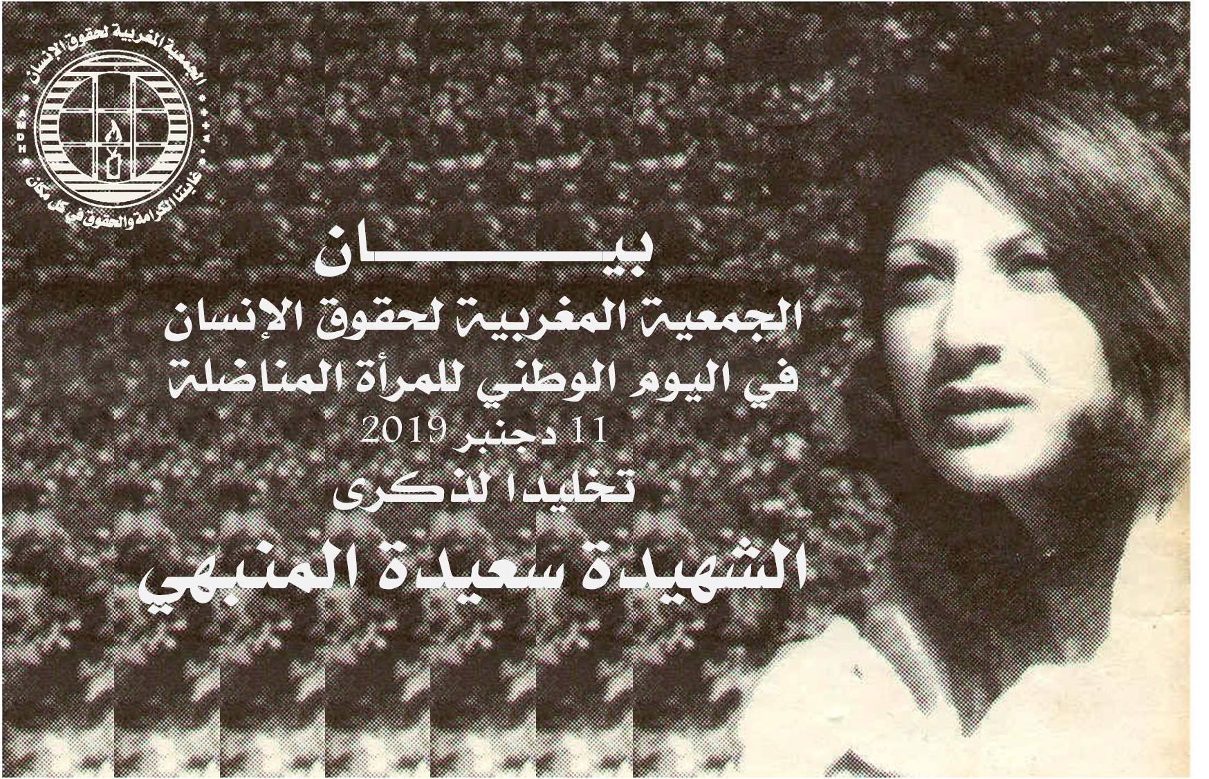 إن الجمعية المغربية لحقوق الإنسان، وهي تقف وقفة إجلال لروح الشهيدة سعيدة المنبهي وكافة الشهيدات وشهداء الشعب المغربي: