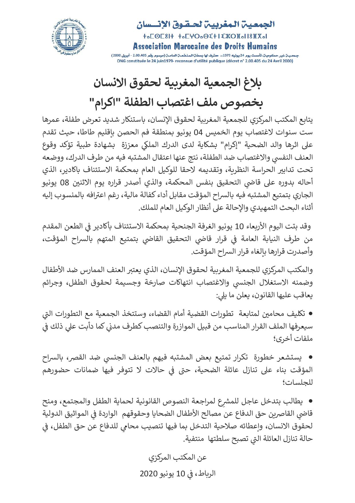والمكتب المركزي للجمعية المغربية لحقوق الإنسان، الذي يعتبر العنف الممارس ضد الأطفال وضمنه الاستغلال الجنسي والاغتصاب انتهاكات صارخة وجسيمة لحقوق الطفل، وجرائم يعاقب عليها القانون، يعلن ما يلي: