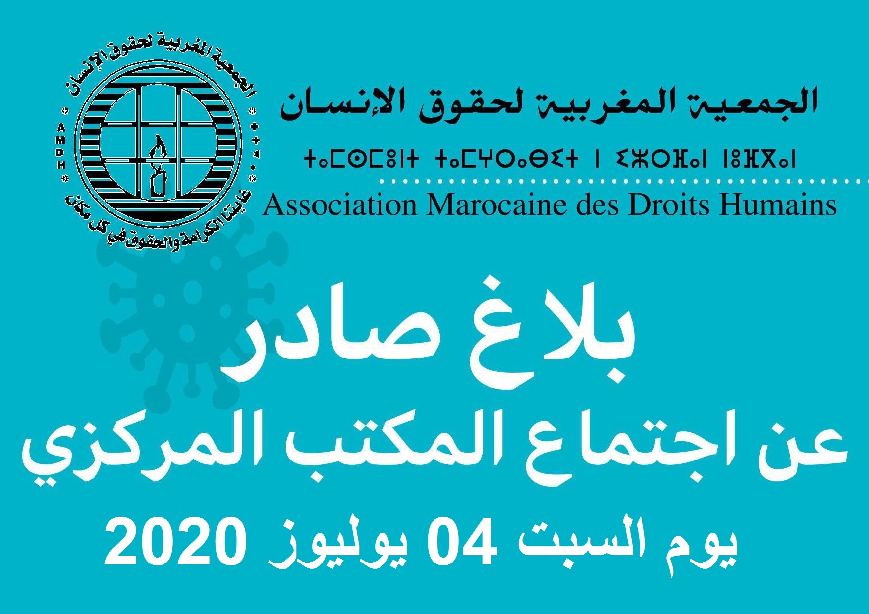 اجتمع المكتب المركزي، عن بعد، في دورته العادية بتاريخ 04 يوليوز 2020، وبعد تدارسه لتطورات أوضاع حقوق الإنسان في ظل الحالة الوبائية التي تعرفها بلادنا ومختلف دول العالم، وما خلفتها الإجراءات التدبيرية لمواجهتها من انتهاكات سافرة للحقوق والحريات، وبعد وقوفه، بصفة خاصة، على أهم القضايا التي استجدت منذ اجتماعه الأخير، من ضمنها قضايا قرر إفراد بيانات خاصة لها، وبعد اطلاعه على تقارير عن أشغال اللجن المركزية وفرق العمل ومناقشتها، وبعد انتهائه من التداول في كل القضايا المسطرة في جدول أعماله، قرر تبليغ الرأي العام ما يلي:
