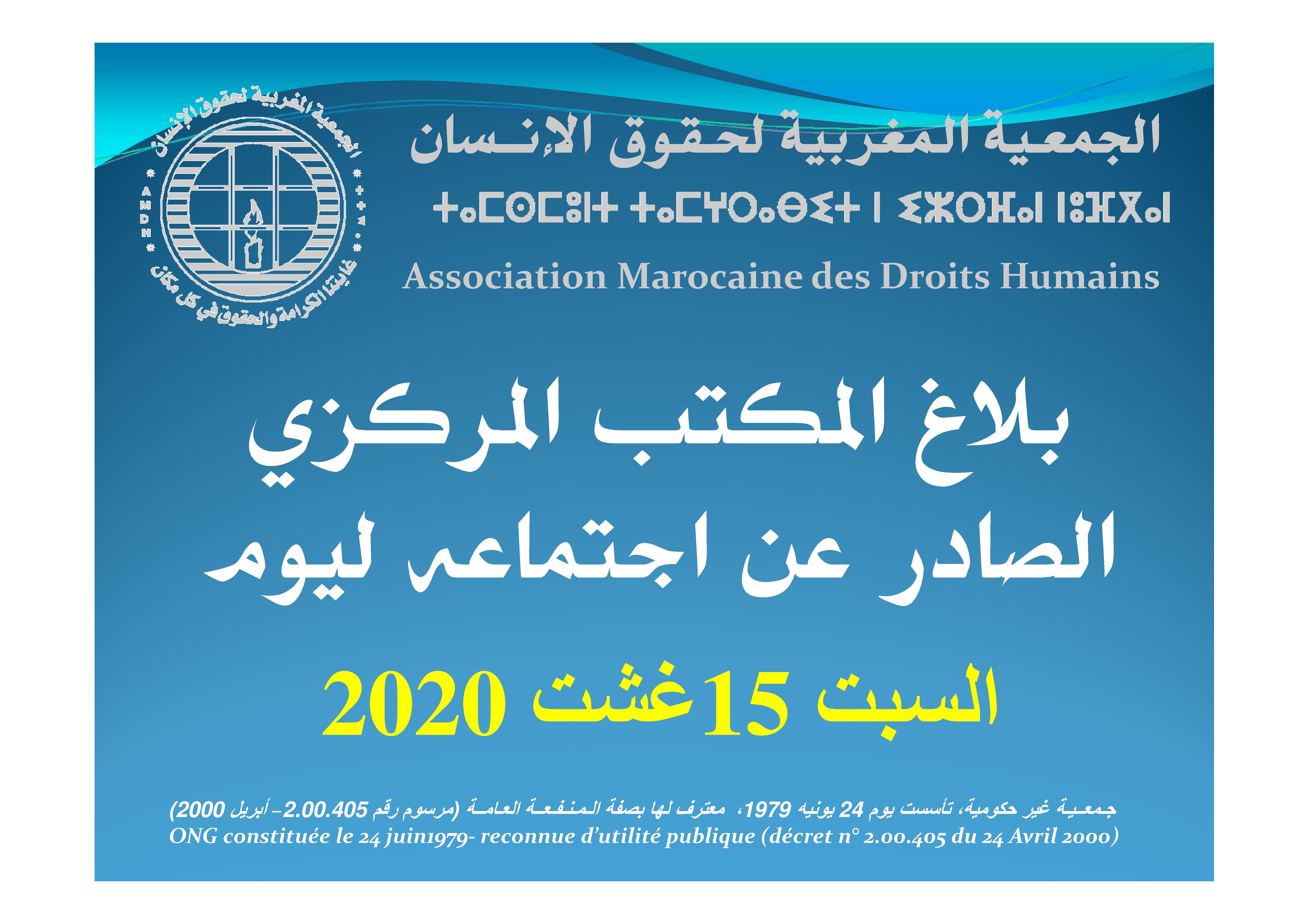 عقد المكتب المركزي للجمعية المغربية لحقوق الإنسان اجتماعه الدوري العادي، يوم السبت 15 غشت 2020، وبعد الاطلاع على تقرير المهام المنجزة منذ الاجتماع الأخير، والوقوف عند مستجدات الوضع الحقوقي ومناقشتها، والاطلاع على تقارير اللجان المركزية وفرق العمل، قرر المكتب المركزي تبليغ الرأي العام ما يلي: