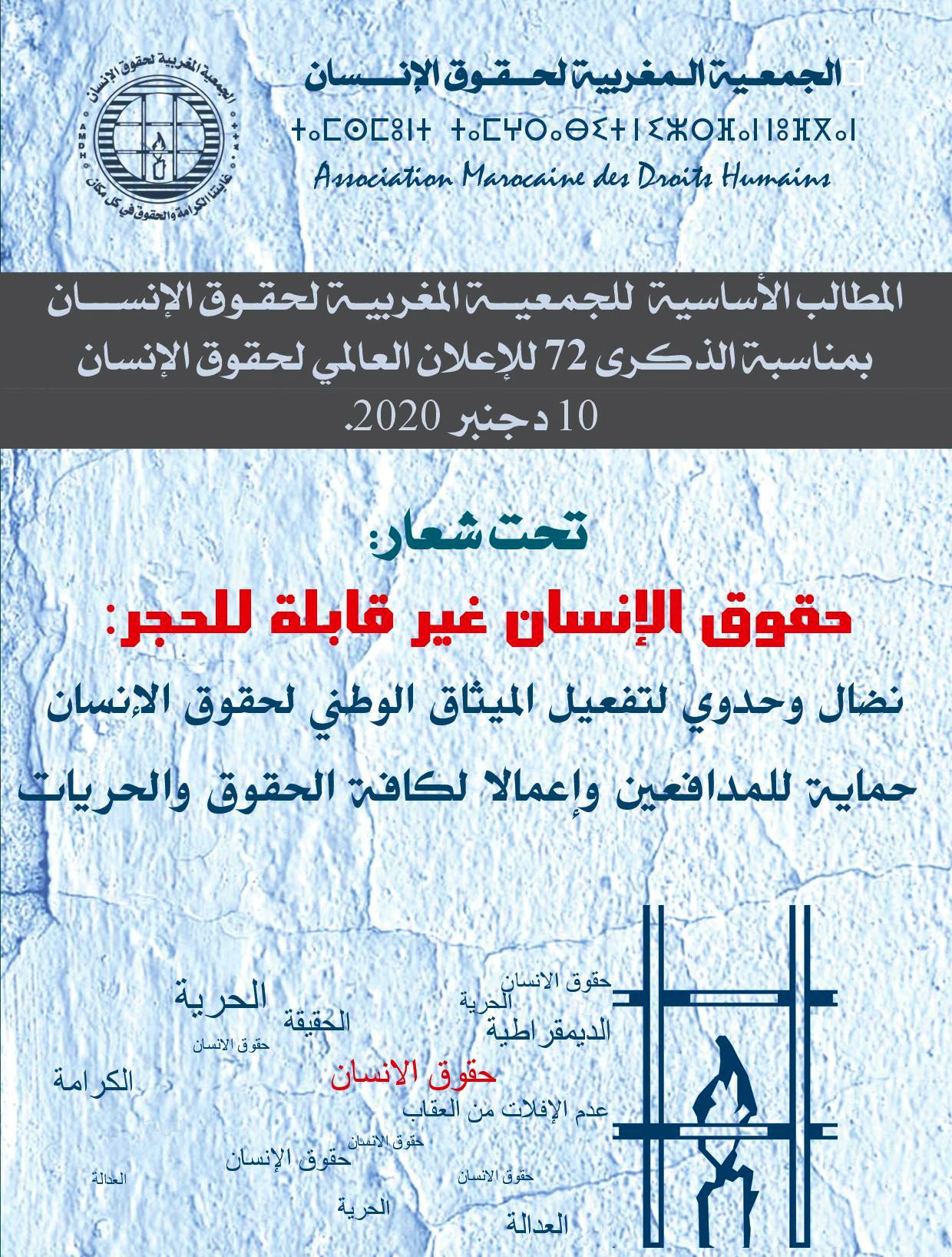 تخلد شعوب العالم وقواها الحقوقية والديمقراطية عبر بلدان العالم، وهيئات منظمة الأمم المتحدة يوم 10 دجنبر من هذه السنة الذكرى 72 لصدور الإعلان العالمي لحقوق الإنسان. ولقد اختارت الأمم المتحدة كشعار له هذه السنة موضوع: " إعادة البناء بشكل أفضل – قوموا ودافعوا عن حقوق الإنسان".
