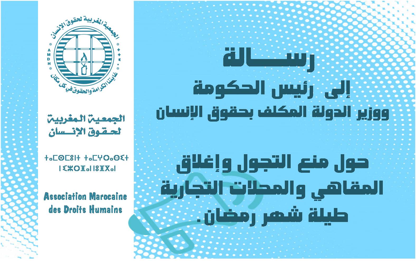 وقف المكتب المركزي للجمعية المغربية لحقوق الإنسان على قراركم القاضي بمنع التجول وإغلاق المقاهي والمحلات التجارية بين الساعة الثامنة ليلا والساعة السادسة صباحا طيلة شهر رمضان، في إطار سياستكم الرامية إلى محاربة انتشار جائحة "كوفيد-19"؛ وبعد استحضاره لما يكتسيه هذا التدبير من حجر غير مشروع ولا متناسب، يضر ضررا بليغا بممارسة جملة من الحريات الأساسية؛ وتدارسه لمختلف الحيثيات المرتبطة بالوضعية الاقتصادية والاجتماعية، لفئات واسعة من المواطنين والمواطنات، المتسمة أساسا بالهشاشة، والتي ستتفاقم، لا محالة، بسبب هذه الإجراءات التي ستحرمهم من مصدر عيشهم وقوتهم اليومي، دون أن تكشفوا عن أية خطة بديلة للحد من الآثار السلبية لذلكم القرار على الحركة الاقتصادية بشكل عام، وعلى إعمال الحق في الشغل للملايين من العمال والعاملات، وحماية مصالح أصحاب المحلات التجارية المستهدفة بالإغلاق بشكل خاص؛ وهو إذ يسجل هذا يجدد تأكيده على ما يلي: