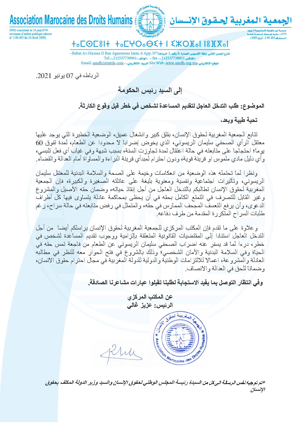 وعلاوة على ما تقدم فإن المكتب المركزي للجمعية المغربية لحقوق الإنسان يراسلكم أيضا من أجل التدخل العاجل استنادا إلى المقتضيات القانونية المتعلقة بإلزامية ووجوب تقديم المساعدة لشخص في خطر، درءا لما قد يسفر عنه اضراب الصحفي سليمان الريسوني عن الطعام من فاجعة تمس حقه في الحياة وفي السلامة البدنية والأمان الشخصي؛ وذلك بالشروع في فتح الحوار معه للنظر في مطالبه العادلة والمشروعة، اعمالا للالتزامات الوطنية والدولية للدولة المغربية في مجال احترام حقوق الانسان، وضمانا للحق في العدالة والانصاف.