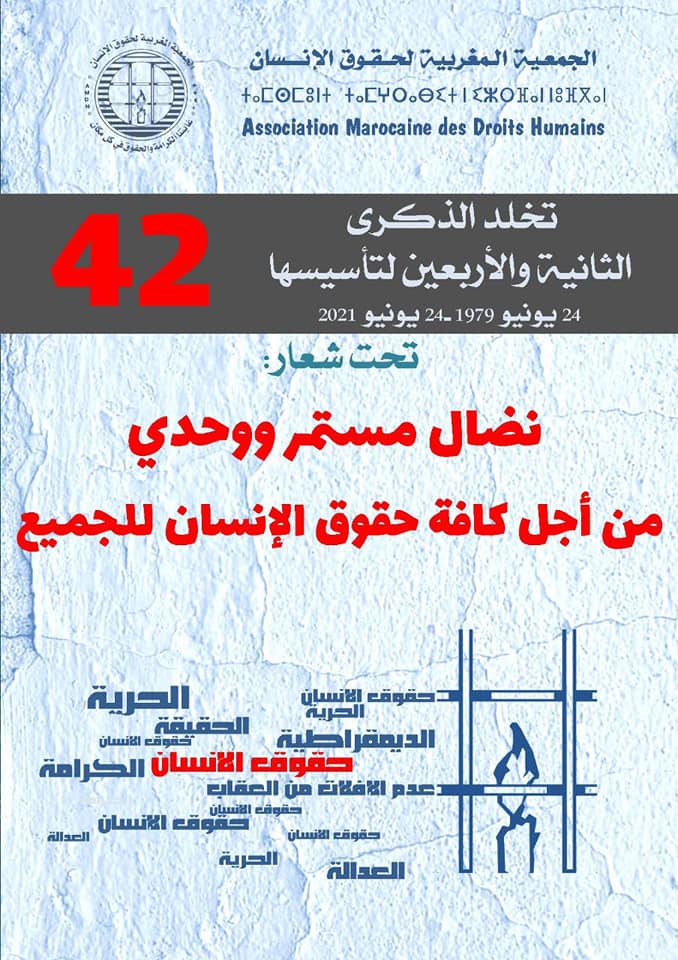 تحل، اليوم الخميس 24 يونيو 2021، الذكرى الثانية والأربعون لتأسيس الجمعية المغربية لحقوق الإنسان (24 يونيو 1979)، بعد 42 سنة من النضال من أجل مغرب تسوده قيم الكرامة والحرية والمساواة والديمقراطية والعدالة الاجتماعية وكافة حقوق الانسان للجميع، وقد قرر المكتب المركزي إحياء هذه الذكرى تحت شعار: " نضال مستمر ووحدي من أجل كافة حقوق الإنسان للجميع ". وذلك للتاكيد على استمرار الجمعية إلى جانب كافة القوى الديمقراطية الحية في بلادنا، في نضالها من أجل إقرار حقوق الإنسان الكونية والشمولية، ووقوفها مع كافة ضحايا انتهاكات حقوق الانسان.