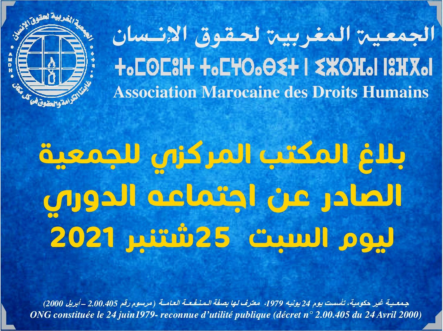 إن المكتب المركزي، المجتمع في دورته العادية بتاريخ 25 شتنبر2021، بعد تدارسه لمختلف تطورات أوضاع حقوق الإنسان التي تتعرض للعديد من الانتهاكات السافرة، وبعد وقوفه، بصفة خاصة، على أهم القضايا التي استجدت منذ اجتماعه الأخير، قرر إفراد بيانات خاصة لبعضها، وبعد استماعه لتقارير اللجن المركزية وفرق العمل ومناقشتها، وبعد انتهائه من التداول في كل القضايا المسطرة في جدول أعماله، قرر تبليغ الرأي العام ما يلي: