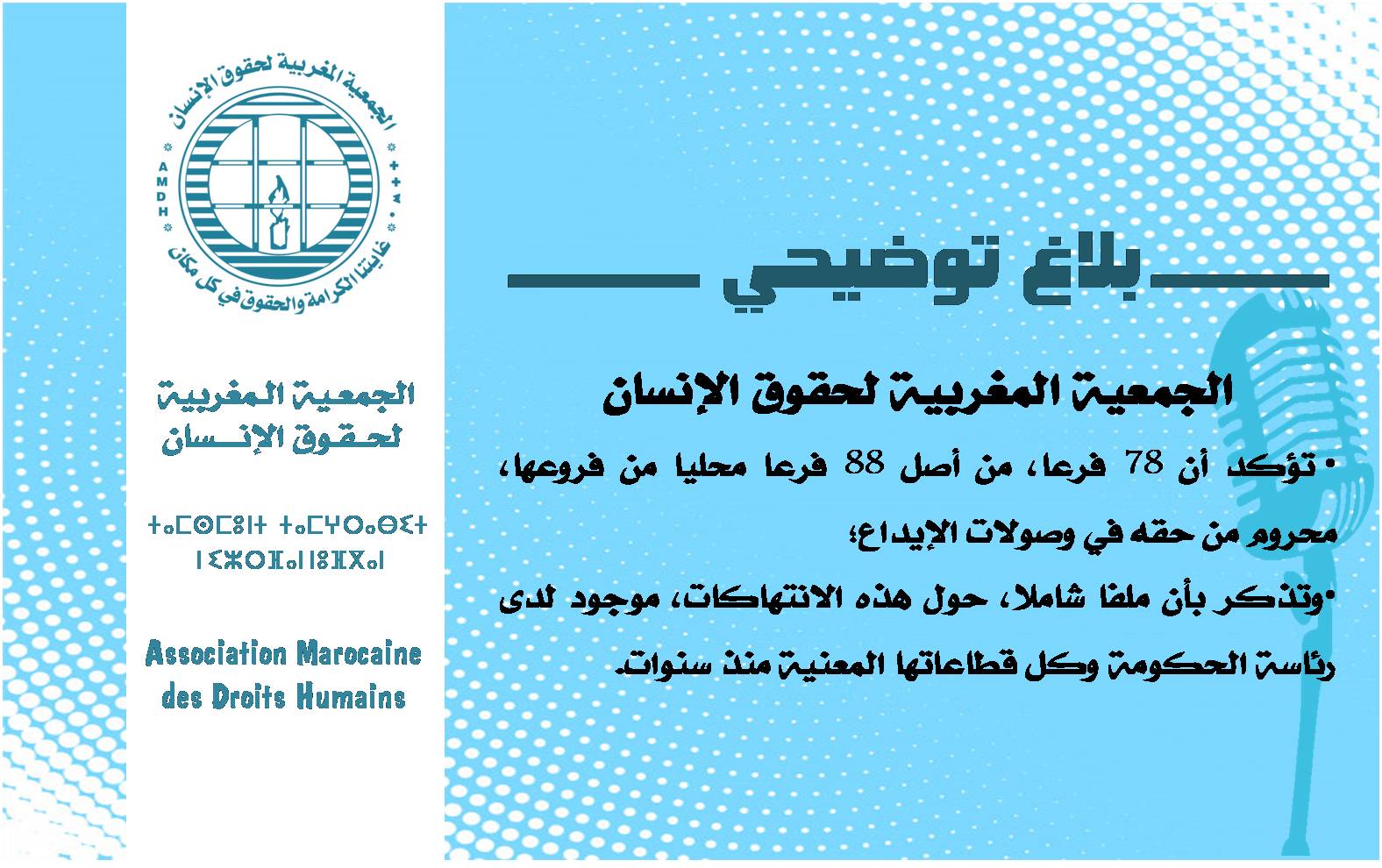 وعلى الرغم من أن المؤسسات المعنية بحقوق الإنسان في أي بلد من واجبها، بحكم وظيفتها في مجال الحماية والنهوض، التحري والتحقيق في كل ما يلحق هذه الحقوق من انتهاكات، وألا تنتظر حتى تتوصل بالشكايات والتظلمات لتتحرك، فإن المكتب المركزي للجمعية درءا لكل التباس أو تبرير يعيد نشر لائحة الفروع، التي لا تتوفر على وصولات الإيداع، أملا في أن تعمل المندوبية الوزارية المكلفة بحقوق الإنسان، على القيام بالدور المنوط بها في حماية الحقوق والحريات الأساسية. والحال أن عدد الفروع المحرومة من هذه الوصولات أو التي تمتنع السلطات حتى عن تسلم ملفات تجديد مكاتبها، بلغ، حتى الآن، 78 فرعا من أصل 88 فرعا محليا بالمغرب؛ وهي فروع: وجدة، الناظور، كرسيف، تاوريرت، جرادة، بوعرفة، بني تاجيت، طنجة، تطوان، الشاون، المضيق، أصيلة، العرائش، وزان، القصر الكبير، الحسيمة، إمزورن، فاس، فاس سايس، المنزل، تازة، تاهلة، تاونات، غفساي، قرية بامحمد، ميسور، أوطاط الحاج، مكناس، الحاجب، أزرو، سبع عيون، الرباط، تمارة، سلا، القنيطرة، سيدي يحيى، سيدي سليمان، سيدي قاسم، الخميسات، البيضاء، البرنوصي، المحمدية، الجديدة، بني ملال، قصبة تادلة، زاوية الشيخ، الفقيه بنصالح، سوق السبت، خريبكة، وادي زم، أبي الجعد، القصيبة، خنيفرة، مريرت، مراكش المنارة، القلعة، أسفي، بنكرير، العطاوية، أيت أورير، إيمنتانوت، ميدلت، بوميا، تنغير، ورزازات، زاكورة، بيوكرى، أكادير، إنزكان، تيزنيت، طاطا، طانطان، كلميم، بويزكارن، إفني، أسا، العيون، السمارة؛ اضافة إلى 10 فروع جهوية.