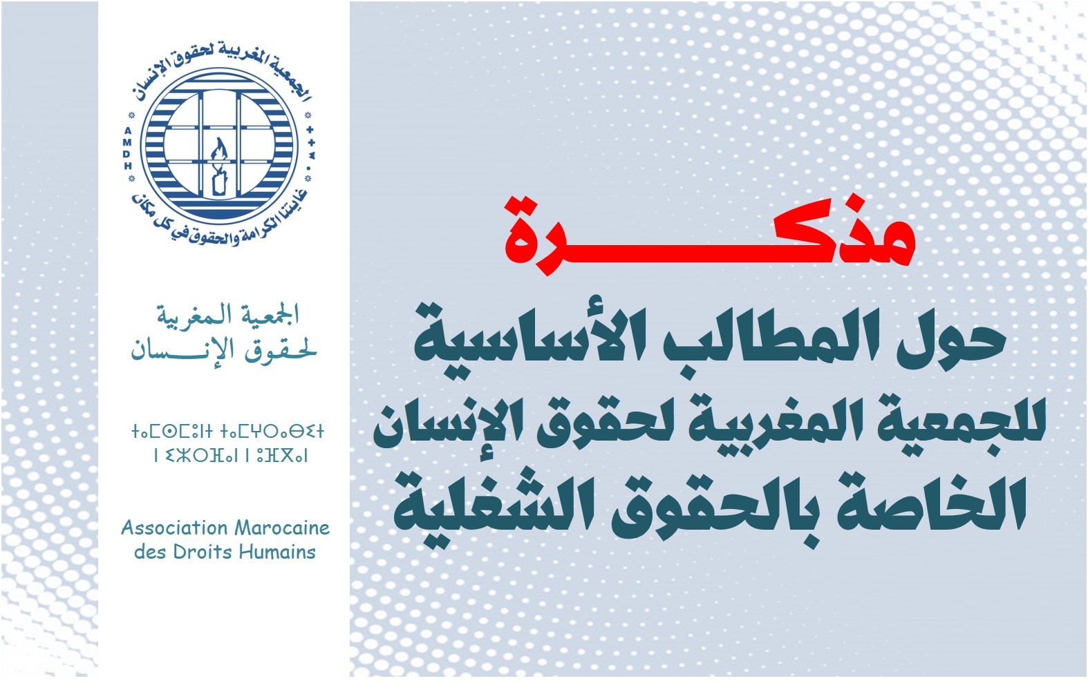 فإن الجمعية وهي تعمل، في إطار دفاعها الثابت عن الحقوق الشغلية والحق في العمل، من أجل مصادقة بلادنا على كافة المواثيق والاتفاقيات المتضمنة لهذه الحقوق، وإدماج مقتضياتها في التشريع المغربي، مع التطبيق الفعلي لهذه التشريعات في الواقع؛ فإنها تهدف من خلال هذه المذكرة، الموجهة للسلطات المعنية وللرأي العام، والتي تتقاسمها مع عدد من مكونات الحركة الحقوقية والنقابية، إلى تجديد التأكيد على مطالبها الأساسية المتعلقة بالحق في الشغل والحقوق العمالية، والمتمثلة فيما يلي:
