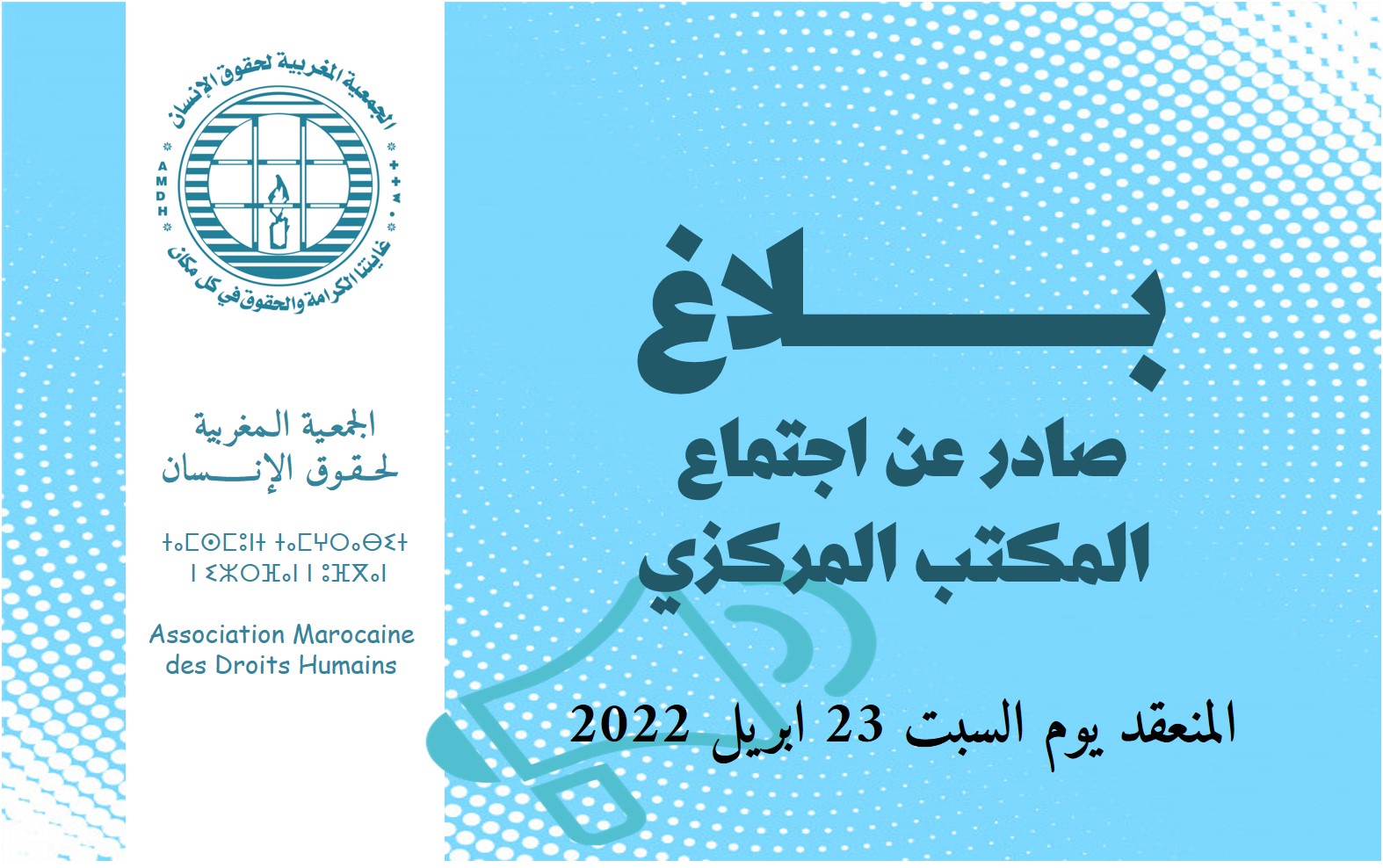 عقد المكتب المركزي للجمعية المغربية لحقوق الإنسان، يوم 23 أبريل 2022، اجتماعه الدوري العادي في ظل أوضاع تتسم بالتردي العام للحقوق الأساسية للمواطنين والمواطنات وانتهاك الحريات العامة، ومصادرة الحق في الاحتجاج والتظاهر السلميين، وقمع حرية التعبير، وتكريس منطق القبضة الأمنية، والتضييق على المدافعين والمدافعات عن حقوق الإنسان والمدونات والمدونين وتواتر المتابعات القضائية والمحاكمات الصورية...؛