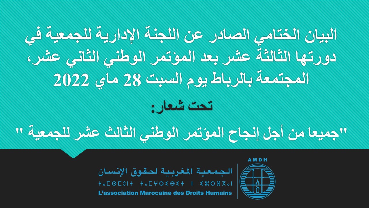 البيان الختامي الصادر عن اللجنة الإدارية للجمعية المغربية لحقوق الإنسان في دورتها الثالثة عشر بعد المؤتمر الوطني الثاني عشر، المجتمعة بالمقر المركزي للجمعية يوم السبت 28 ماي 2022 تحت شعار: "جميعا من أجل إنجاح المؤتمر الوطني الثالث عشر للجمعية"
