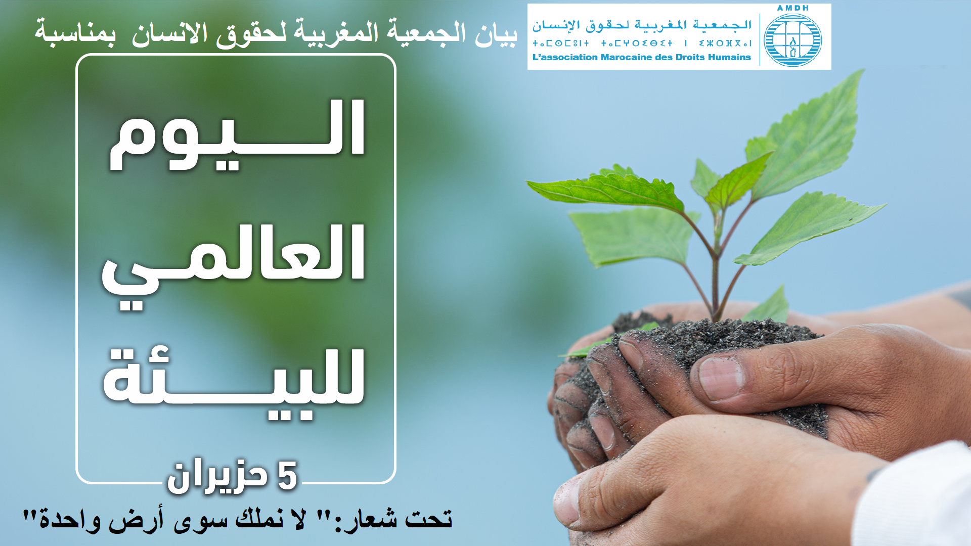 والجمعية المغربية لحقوق الإنسان، إذ تجعل من الحق في بيئة سليمة أحد أهم انشغالاتها الكبرى، وتستحضر التحديات التي بات يشهدها العالم الحديث لمواجهة الأخطار التي تتهدد الحق في بيئة سليمة، كجزء من الحق في الحياة، ليس فقط للإنسان ولكن أيضا لكل الكائنات الحية؛ ونظرا لأن اليوم العالمي للبيئة، لهذا العام، سيكون هو بدايات عقد الأمم المتحدة لاستعادة النظام البيئي إلى حدود 2030؛ وهي مهمة عالمية لإحياء مليارات الهكتارات من الغابات والأراضي الزراعية، من أعالي الجبال إلى أعماق البحار؛ فإنها تطالب الدولة المغربية بما يلي: