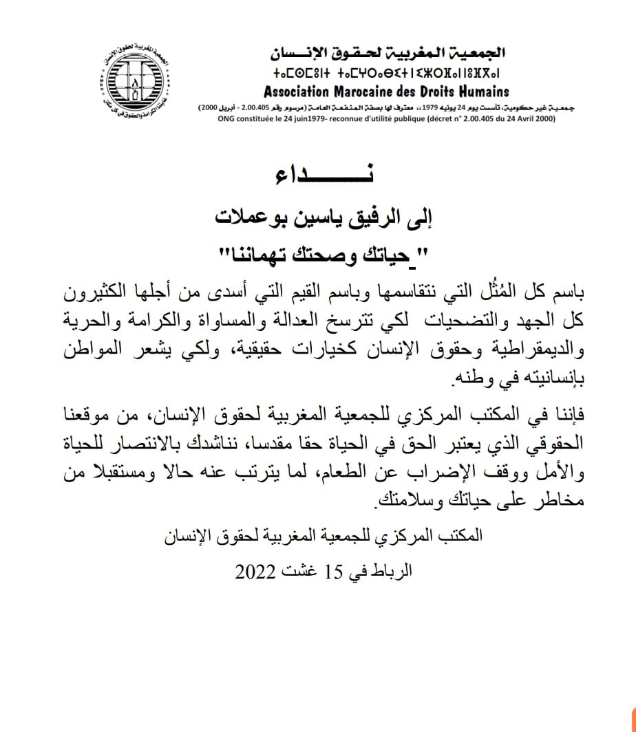 فإننا في المكتب المركزي للجمعية المغربية لحقوق الإنسان، من موقعنا الحقوقي الذي يعتبر الحق في الحياة حقا مقدسا، نناشدك بالانتصار للحياة والأمل ووقف الإضراب عن الطعام، لما يترتب عنه حالا ومستقبلا من مخاطر على حياتك وسلامتك.