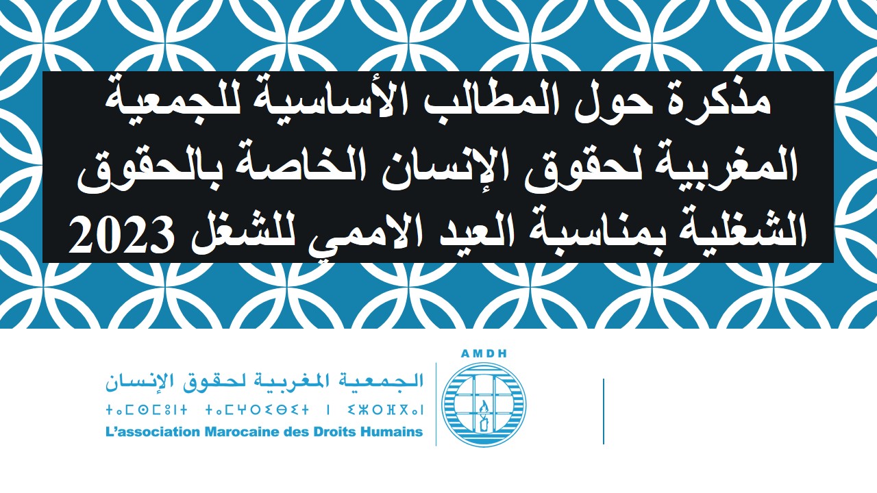 فإن الجمعية المغربية لحقوق الإنسان، في إطار دفاعها الثابت عن الحقوق الشغلية والحق في العمل، ومن أجل مصادقة بلادنا على كافة المواثيق والاتفاقيات المتضمنة لهذه الحقوق، وإدماج مقتضياتها في التشريع المغربي، مع التطبيق الفعلي لهذه التشريعات في الواقع، وقد اختارت أن تخلد العيد الاممي للشغيلة هذه السنة تحت شعار: " تحت شعار" نضال وحدوي من أجل الدفاع عن الحقوق الشغلية، وضد الغلاء والقهر الاجتماعي"، وتروم، من خلال هذه المذكرة، التي تتقاسم مضمونها مع عدد من مكونات الحركة الحقوقية والنقابية، والتي تتوجه بها إلى السلطات المعنية والرأي العام، تجديد التأكيد على مطالبها الأساسية المتعلقة بالحق في الشغل والحقوق العمالية، والمتمثلة فيما يلي: