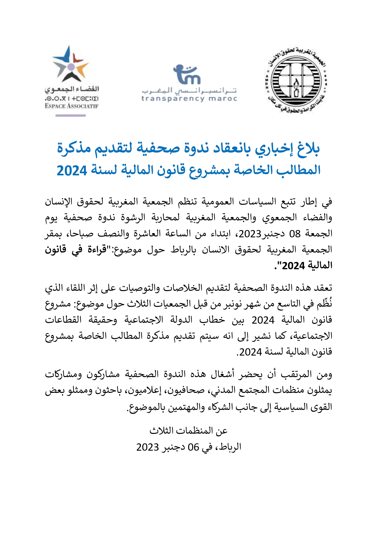 بلاغ إخباري بانعقاد ندوة صحفية لتقديم مذكرة المطالب الخاصة بمشروع قانون المالية لسنة 2024