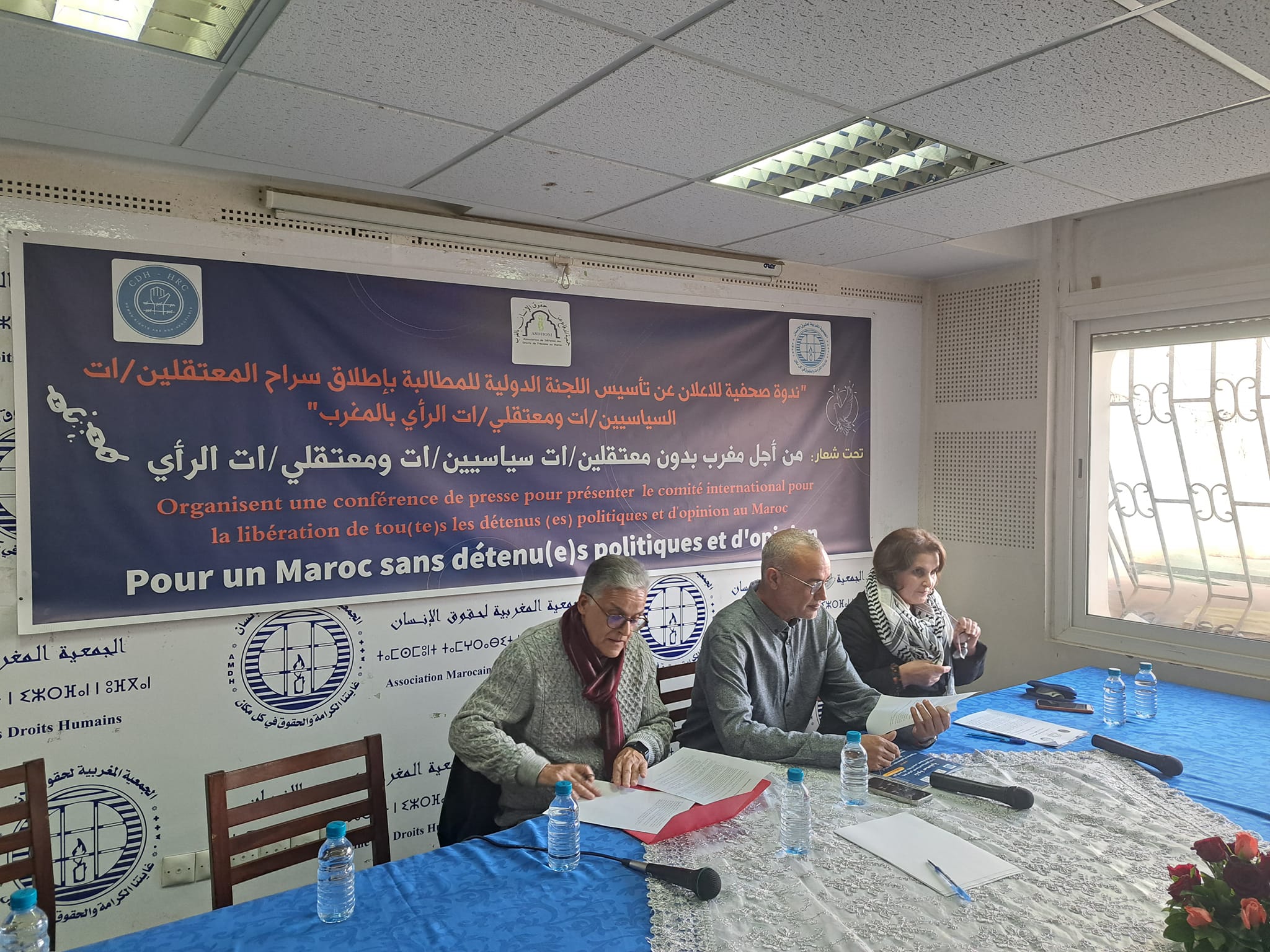 عقدت بالمقر المركزي للجمعية المغربية لحقوق الإنسان، صباح يوم الخميس 07 دجنبر 2023، ندوة صحفية من تنظيم لجنة التنسيق بين الجمعية المغربية لحقوق الإنسان وجمعية الدفاع عن حقوق الإنسان بالمغرب التي يوجد مقرها بباريس، ومركز حقوق الإنسان بأمريكا الشمالية المتواجد مقره بنيويورك، حيث تم الإعلان عن اللجنة الدولية من أجل الإفراج عن المعتقلين السياسيين ومعتقلي الرأي بالمغرب التي تضم شخصيات وفعاليات عالمية معروفة في الساحة الحقوقية والثقافية والسياسية بدفاعها عن مبادئ حقوق الإنسان وتشبثهم بقيمها وبنضالهم من أجل الحرية والكرامة الإنسانية في كل مكان، ومنهم من عرف بدوره تجربة الاعتقال السياسي بالمغرب في القرن الماضي.
